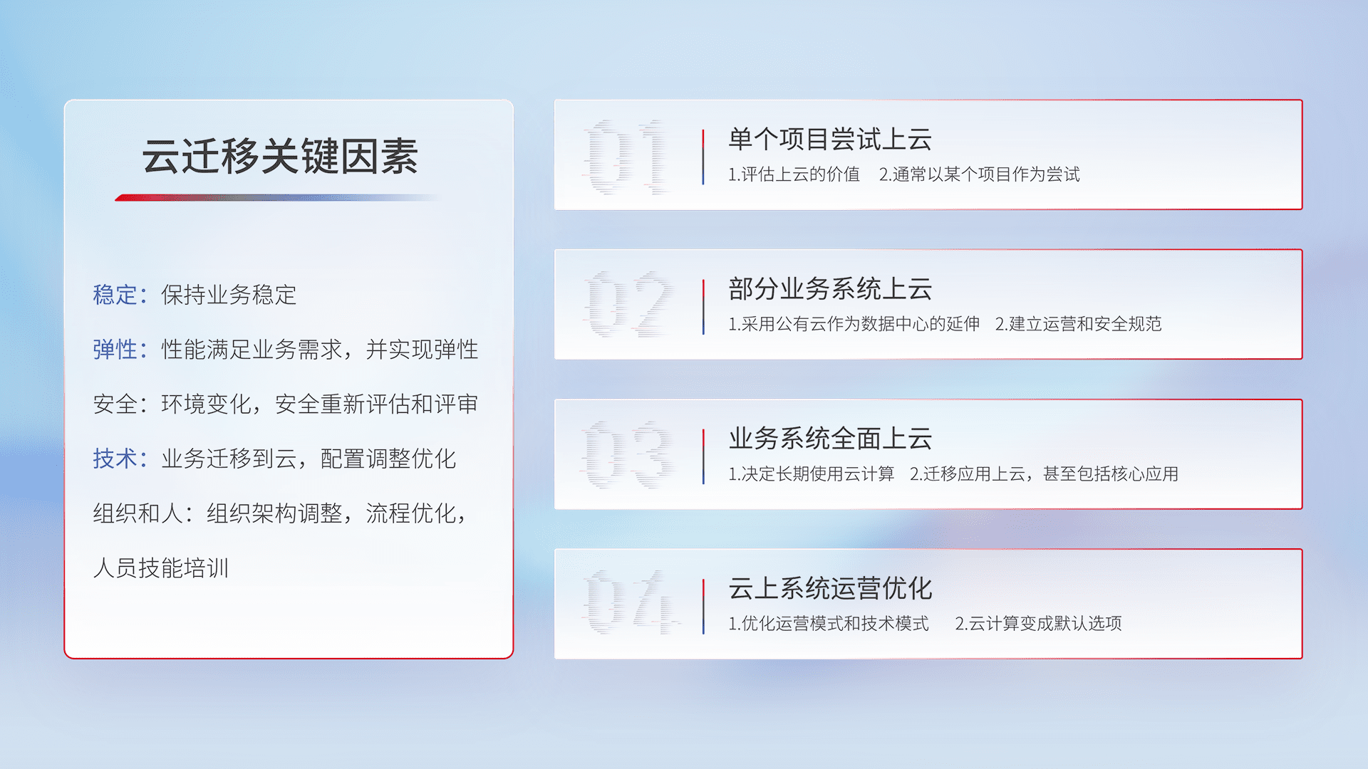 结合实际业务,,,从规划设计、、云平台选型、、云原生改造、、数据迁移、、、集成交付,,,,迁移全过程为客户识别最佳上云路径,,做好风险识别管理,,,,设计网络架构、、、、身份权限、、、安全审计合规、、、操作审计、、、、日志审计、、监控告警策略、、、、多站点容灾设计等,,,对云上基础设施进行整体规划,,提升IT治理水平,,,,以满足弹性、、、、高可用、、、、高性能的需求。。。