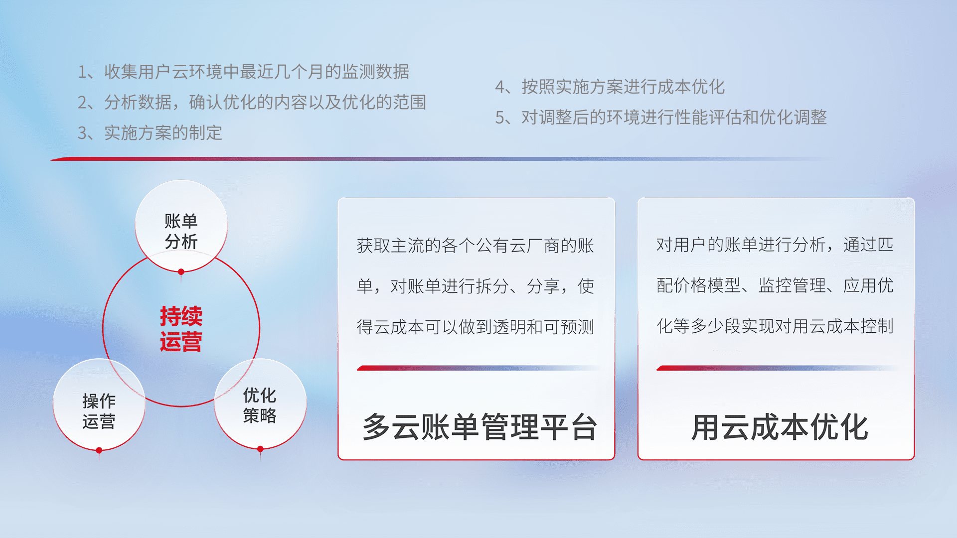 通过多云纳管,,,,以统一的资源数据模型把客户的云资源进行抽象和封装,,,,进而实现对多云资源的统一操作,,,保障云资源管理的可靠性、、、、稳定性与可用性。。。量身定制化运维内容,,,,配置、、、、开发运维、、、、补丁管理、、、备份、、、、监控、、认证和访问管理、、、审计和日常巡检等,,保障在用云过程中的可靠度,,,稳定度以及高可用率。。。